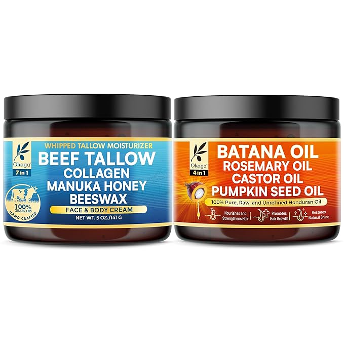 If you’re tired of watching your hair thin, your scalp dry out, or your skin lose its natural glow, this bundle was made for you. The Okaga Skin & Hair Wellness Bundle pairs two powerhouse formulas—a deeply hydrating Beef Tallow Balm and a nutrient-packed Batana Hair Oil—to help address the root of dryness, brittleness, and lackluster appearance from head to toe.